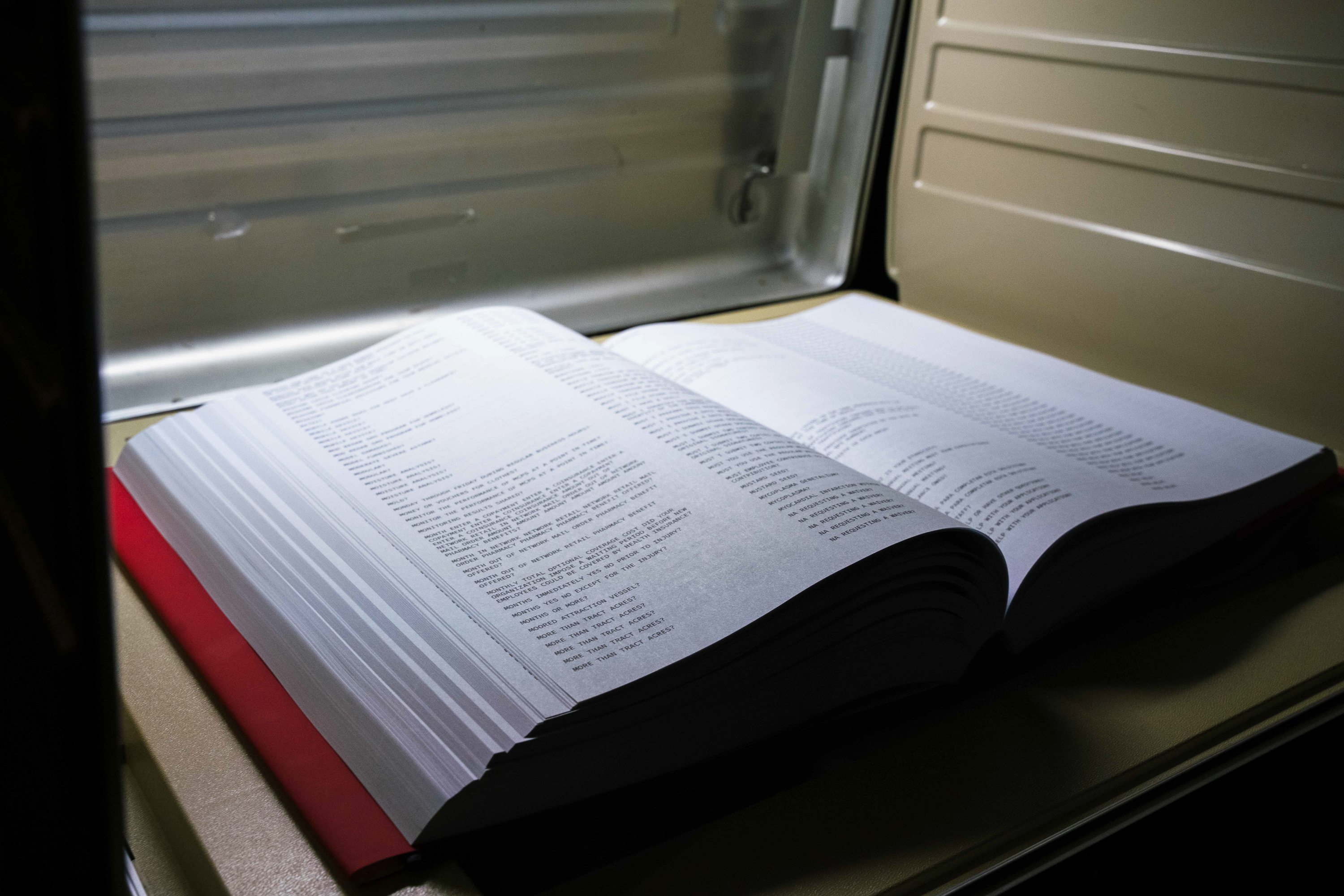 DO YOU HAVE ANYTHING TO REPORT? is an attempt to capture and frame the sprawling, almost sublime scale of the state’s boundless impulse to interrogate. A long duration installation video provides an ambient, visceral encounter with this rationality and an accompanying book provides an index and guide to those things which are legible to the state, and implicitly, those which are not.